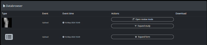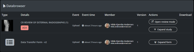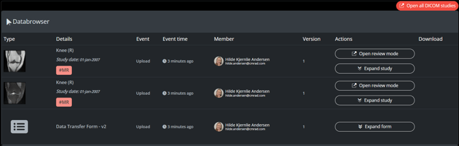 The databrowser displays content previously added to the subject, and allows for assessment. By selecting the buttons to the right of the different elements, the project member may read the content of forms, and/or open DICOM studies in the image viewer (the viewer will open in a separate tab). When more that one image study is available, all studies may be opened simultaneously in the viewer by selecting the red "Open all DICOM studies" button in the top right corner.