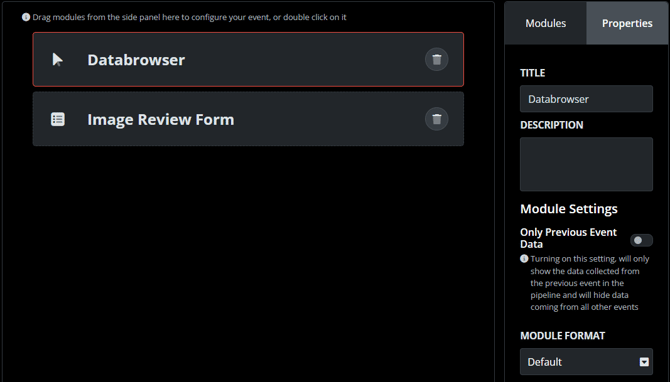 When the module is highlighted, the properties of the databrowser may be set in the right panel, where the default setting is that inputted data from all previous events should appear in the databrowser, or you can choose to display only the inputted data from the previous event.: