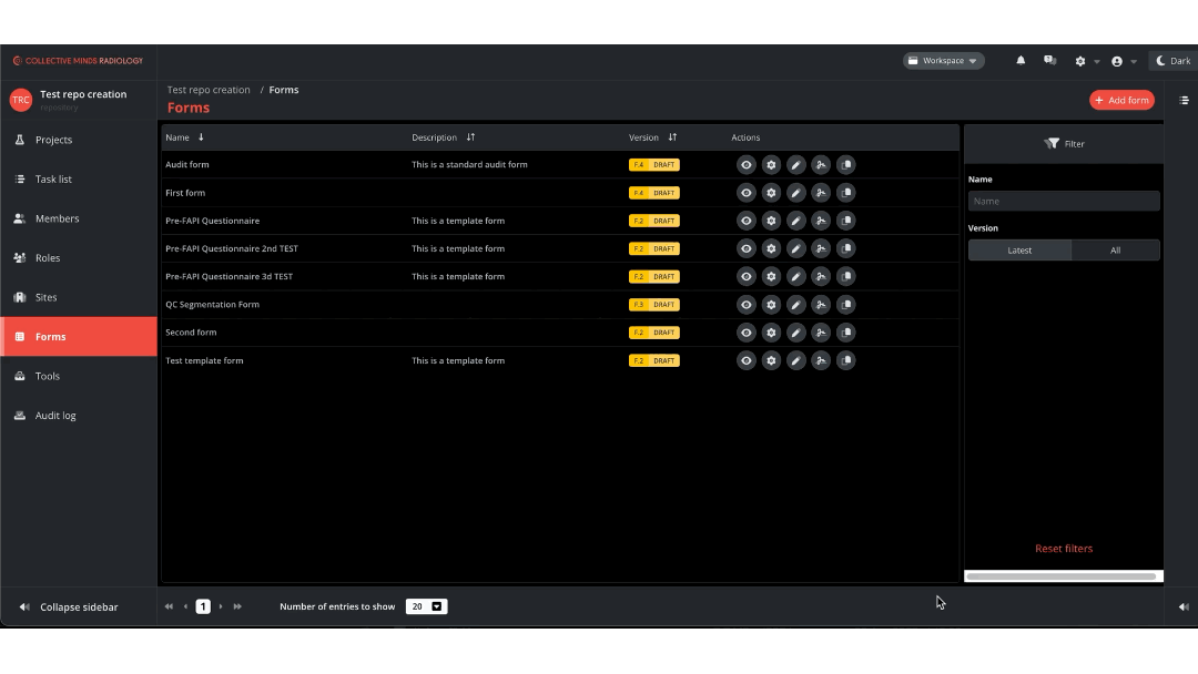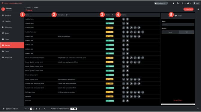 - Filter: allows you to search for specific forms by name or to display only the most recent (draft) versions.