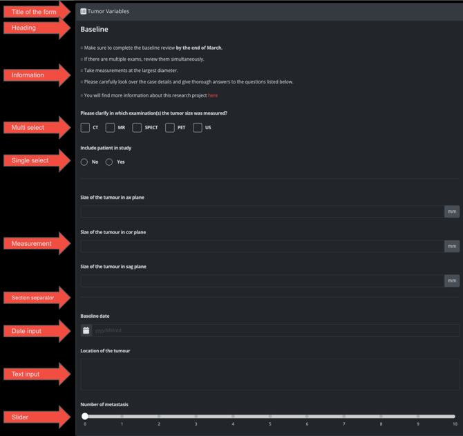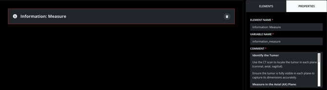 The Information element is a versatile tool that allows you to provide detailed instructions, additional information, or helpful links to users filling out the form. For instance, you can include step-by-step guidance on how to complete the form accurately, link to external resources for further reference (for example, you can link to relevant cases uploaded on another instance within the CMRAD system), or offer explanations for specific questions. This element is invaluable for enhancing user understanding and ensuring a smooth form-filling experience.